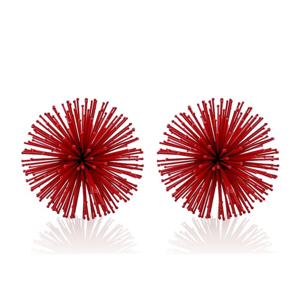 Unique and decorative, this set of two red iron decorative spiky sphere tabletop sculpture will leave a lasting impression. This red hued piece represents high quality, expertly made from high grade iron. It's a perfect addition for those who love an up-to-the-minute look and feel. 4-inch h x 4-inch w x 4-inch d.