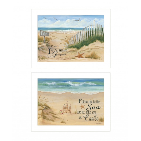 Bring some sizzle to your space with this eye-catching set of two sand castle and footprints 1 white framed print wall art. This print is a visual artistic expression that allows you to decorate your space in style. Reproduced for you on wood, this hanging decorative accent will be a trendy and fashionable way to dress your walls in a rustic and modern farmhouse vibe. Hang on your wall to add some up to date fashion and decoration. Utilize this opportunity to create a focal point in the room with this fabulous wall decor option. 31-inch H x 19-inch W x 1-inch D