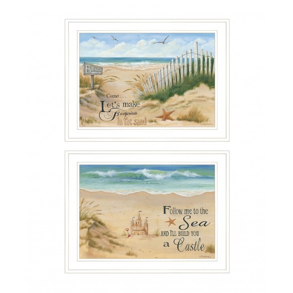 Bring some sizzle to your space with this eye-catching set of two sand castle and footprints 2 white framed print wall art. This print is a visual artistic expression that allows you to decorate your space in style. Reproduced for you on wood, this hanging decorative accent will be a trendy and fashionable way to dress your walls in a rustic and modern farmhouse vibe. Adding this hanging wall art to your space to make your room feel more finished and attractive. Instantly liven up your space with this art that brings color and dimension to your walls. 31-inch H x 19-inch W x 1-inch D