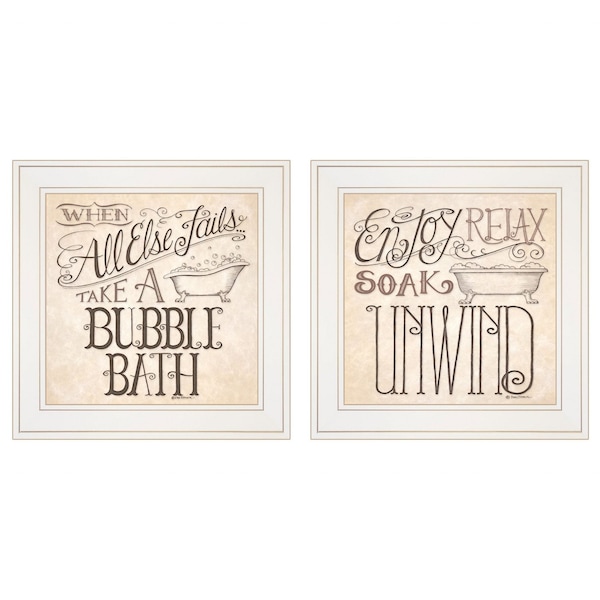 The set of two soak and unwind 2 white framed print bathroom wall art is the perfect decorative accessory for your home. This print is a visual artistic expression that allows you to decorate your space in style. Reproduced for you on paper, this hanging decorative accent will be a trendy and fashionable way to dress your walls. Hang on your wall to add some up to date fashion and decoration. Utilize this opportunity to create a focal point in the room with this fabulous wall decor option. 15-inch H x 15-inch W x 1-inch D