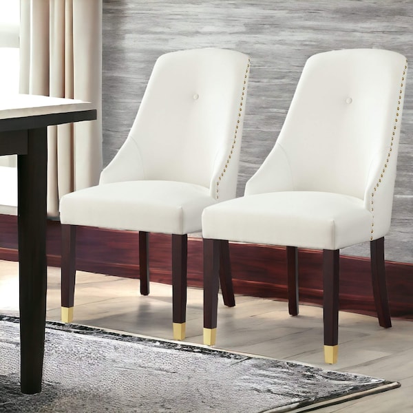 Out with the old and in with the new, this set of two tufted white and espresso upholstered faux leather dining side chairs can perfectly suit any dining table. The addition of a tufted design gives this chair some extra special flair. The side chair has no arms so it can easily fit around the table. Can also be used as an accent in living room or bedroom. Complete with solid back, this chair not only looks good but is comfortable. Nailhead trim gives this chair a refined look that adds additional texture and visual interest. Dining chairs are a great way to compliment your kitchen or dining room but can also be used in the foyer, hallway, or any room you might need extra seating. 38.5-inch H x 20.5-inch W x 27-inch D