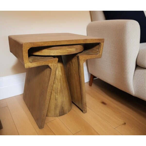 Show off your exquisite taste with this set of two walnut distressed solid wood pedestal nested tables. The nesting feature is a great space saver for when not in use. This table is made from solid wood in a walnut color throughout the base and top. Complete with a purposefully distressed finish, this table has an aged, vintage, and rustic feel. A great accent on either side of the sofa or bed, this adorable end or side table is just what you need. You can also use it as an entryway table to hold your keys. 22.5-inch h x 21-inch w x 18-inch d.