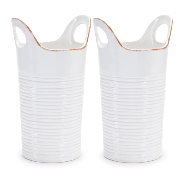 Get ready to accent your space in style with this set of two white and beige ceramic round table vases. Crafted from high-quality ceramic, these vases provide a touch of rustic elegance and refinement to any tabletop arrangement. Their round cylindrical shape features a ridged horizontal stripe design and cut out handles, allowing for versatile placement, making them perfect for both modern and traditional decor. This set of two ensures that you have a cohesive look, whether used together or separately in different areas of your home. Ideal for showcasing fresh flowers or as standalone decorative pieces, they add a subtle charm to your interior design. 11.50-inch h x 6.50-inch w x 5.75-inch d.