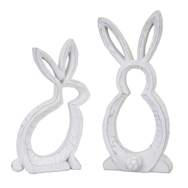 This set of two white polyresin rabbit statue tabletop sculpture will add a beautiful decorative accent to your decor. This white colored piece is made from high grade polyresin. This figurine makes a great tabletop accent for your coffee table, counter, bookshelf, mantle, or even dining table. A perfect decorative addition for anyone who loves a stylish look and feel. Add a sense of the woods, mountain or lodge lifestyle to your space with this good looking rabbit accent. Great to use on its own or mix with other decorations for the perfect look. 10.75-inch h x 4.75-inch w x 2.5-inch d.