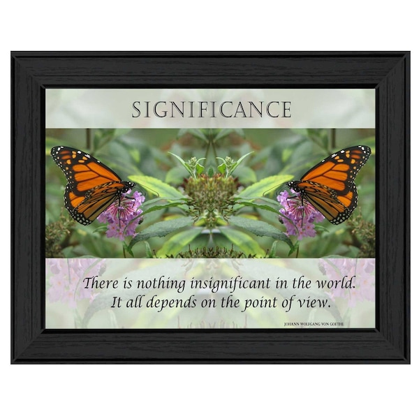 Add an air of fashion to your room and rejuvenate the space with this significance 1 black framed print wall art. Inspired by one of nature's most revered icons, this pretty butterfly inspired artwork will be a beautiful and special addition to your room's decor. This print is a visual artistic expression that allows you to decorate your space in style. Reproduced for you on paper, this hanging decorative accent will be a trendy and fashionable way to dress your walls. Hang on your wall to add some up to date fashion and decoration. Utilize this opportunity to create a focal point in the room with this fabulous wall decor option. 10-inch H x 14-inch W x 1-inch D