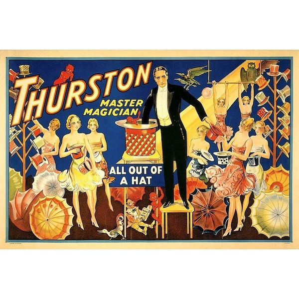 This thurston out of a hat vintage magic unframed print wall art will add a beautiful decorative accent to your decor. This print is a visual artistic expression that allows you to decorate your space in style. Unframed, this flat poster art has a fresh and distinct taste to grace your walls with style. Reproduced for you on paper, this hanging decorative accent will be a trendy and fashionable way to dress your walls. Hang on your wall to add some up to date fashion and decoration. Instantly liven up your space with this art that brings color and dimension to your walls. 36 inches H x 24 inches W x 0.1 inches D