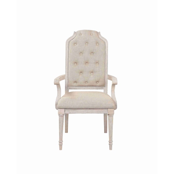 Tufted Antiqued White and Champagne Upholstered Fabric And Solid Wood Dining Arm Chairs, 2PK