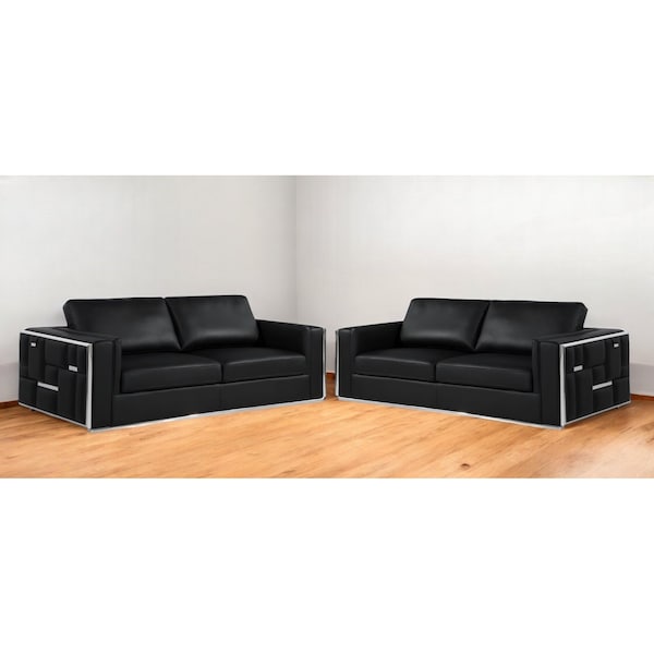 Two Piece Indoor Black Italian Leather Four Person Seating Set