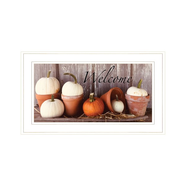 Unique and decorative, this welcome pumpkin shelf 1 white framed print wall art will leave a lasting impression. This print is a visual artistic expression that allows you to decorate your space in style. Reproduced for you on paper, this hanging decorative accent will be a trendy and fashionable way to dress your walls. Hang on your wall to add some up to date fashion and decoration. Utilize this opportunity to create a focal point in the room with this fabulous wall decor option. 12-inch H x 21-inch W x 1-inch D