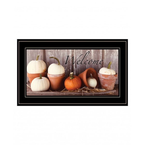 Bring some sizzle to your space with this eye-catching welcome pumpkin shelf 2 black framed print wall art. This print is a visual artistic expression that allows you to decorate your space in style. Reproduced for you on paper, this hanging decorative accent will be a trendy and fashionable way to dress your walls. Hang on your wall to add some up to date fashion and decoration. Instantly liven up your space with this art that brings color and dimension to your walls. 12-inch H x 21-inch W x 1-inch D