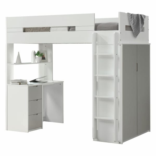 Elevate your space, literally, with this White and Gray Twin Loft Bed and Desk. Made of sturdy laminated veneer, this youth bed adds fun and function to the room, allowing you to utilize the space under the sleeping area as a school work desk area. A great utilization of space, this bed and desk combo is a great choice. This versatile bed frame includes a student left facing desk with 3 drawers and an open compartment, a non-reversible right facing front ladder and a right facing wardrobe. The top bed is complemented by an easy access guard-rail for the optimum safety. This bed, desk, and storage combo will be a functional, fun, and unique addition to a child's bedroom. It has a weight capacity of 165Lbs. Note that top bed is not to be used for children below 6 years of age. 70" X 78" X 41"