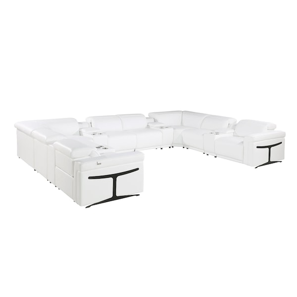An interior designer's dream, this buttery soft high-grade leather white Italian leather power reclining u shaped twelve piece sectional with console will bring just the right touch to your space. The premium leather used makes your lounging luxuriously comfortable and adds an elegant appeal to your space. This sectional includes four power recliners and lots convenient amenities. Square arms offer a comfy place to rest. For the ultimate in relaxation, this sectional includes power push button recline that turns it into a comfy lounge for sleeping or resting. Black metal legs effortlessly elevate the room and add a touch of contemporary design. Great for everyday lounging and for entertaining, sectionals are an ideal way to seat multiple people. 39.00-inch h x 172.00-inch w x 122.50-inch d.