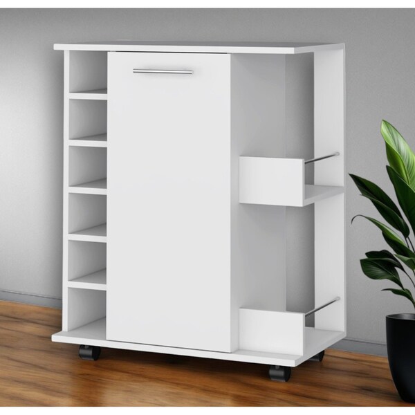 Add a touch of modern elegance to your entertaining space with this white rolling bar cart. The bar cart features a sleek rectangular shape and is made from high-quality manufactured wood for durability. It comes in a crisp white color, adding a clean and refreshing look to any room. Equipped with convenient wheels, you can easily move this cart around your home. The cart includes cabinets for storage, allowing you to keep your bar essentials organized and close at hand. It also features a wine storage area that can hold up to 6 bottles, making it perfect for hosting small gatherings. Upgrade your hosting experience with this stylish and functional bar cart. 32.32-inch H x 25.82-inch W x 14.76-inch D