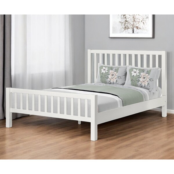 Create a haven for relaxation and sweet dreams with this fabulous white slat back solid wood queen bed frame. This stylish platform bed features a slat style headboard and footboard. We spend so much time in our bedrooms, thus making quality craftsmanship and good looks vitally important. This bed is the perfect way to make your bedroom comfortable and inviting. 43.3-inch h x 85.4-inch w x 63-inch d.