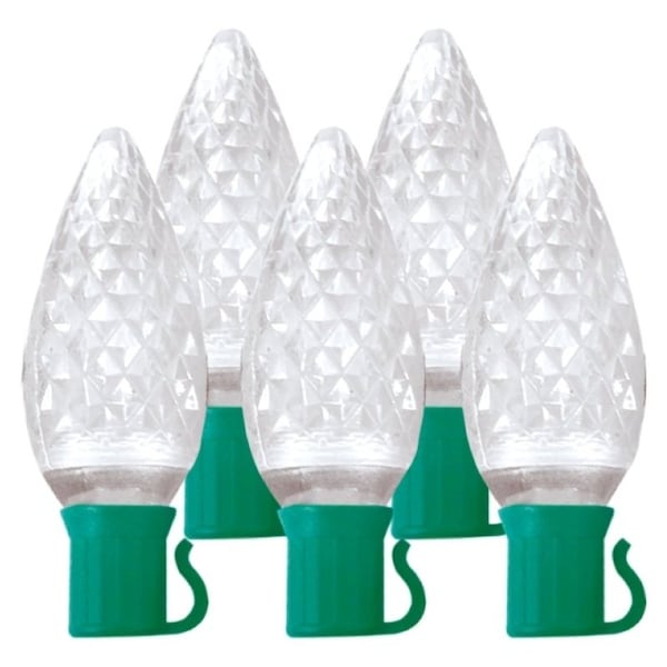 These energy efficient and longlasting C9 LED lights are available in a spool of 70 The length is 473 ft L These C9 LED lights have 77 in spacing between sockets on a green wire with end to end connectors so you can connect multiple sets