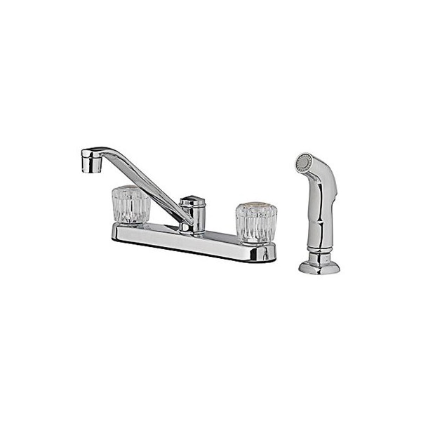 HomePointe, Chrome Finish, 2 Acrylic Handle Kitchen Faucet, With Chrome Spray, 18 GPM, 4 Hole Installation, Brass Waterways, Metal Housing, 14 Turn Washerless Cartridge, 8 Center Distance, Meets California Ab1953 No Lead Standard, For Replacement Hot Cold 2 Handle Washerless Cartridge Use TV 133809