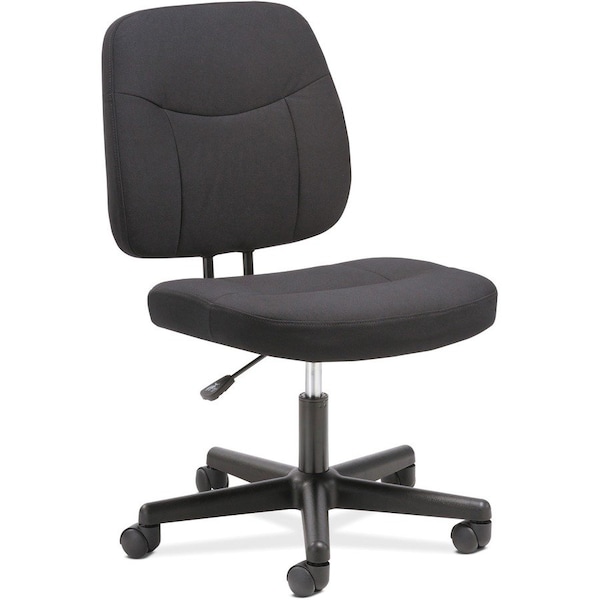 Part of the HON Sadie Collection where quality meets value, this task chair is perfect for your home office but also feels right at home in any corporate office environment. Padded seat and back are covered in black fabric designed for intensive office use. Customize your comfort with pneumatic seat-height adjustment from 16" to 21". Armless design easily fits under virtually any type of worksurface. The 360-degree swivel motion and durable dual-wheeled casters on the nylon five-star base allow you to move anywhere in your work space. Seat measures 19-1/4" wide x 18" depth. This chair meets or exceeds industry standards for safety and durability,