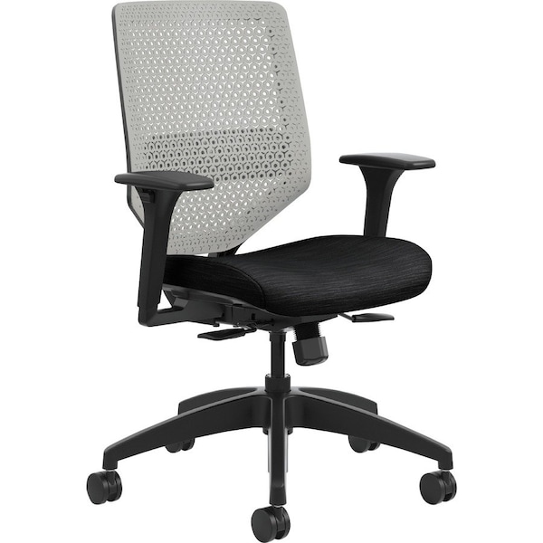 Solve is the single seating solution that helps a variety of users achieve optimal comfort in workstations, touchdown areas, collaborative environments, meeting rooms and more. This Solve mid-back task chair features a breakthrough, ReActiv back material designed to provide enhanced support above and beyond ilira-stretch mesh. It flexes to provide a firm fit and keeps the body cool by enabling continuous airflow. Synchronized seat and back provide proper balance, alignment and lumbar support, and can be adjusted with a single lever. Adjustable-height arms move up and down for shoulder and upper body support. Other functions include pneumatic seat-height adjustment from 18" to 23", 360-degree swivel and tilt tension. Waterfall seat edge promotes better leg circulation. Five-star base is equipped with dual-wheeled casters for smooth mobility. Upholstery color is Ink; frame color is black; and ReActiv back color is Titanium. Weight capacity is 300 lb.
