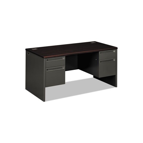 High-pressure laminate top is moisture-, scratch- and stain-resistant. Tru-fit mitered drawers operate on heavy-duty steel ball bearing suspensions. High-sided file drawers extend fully and accept hanging files without hang rails; box drawers extend three-quarters. HON inOne Keyin core removable locks. Two work surface grommets help control cord and wires. Three-quarter height modesty panel for privacy. Series Name: HON 38000 Series; Worksurface/Base Color: Mahogany/Charcoal; Color Family: Mahogany; Worksurface Shape: Rectangular.
