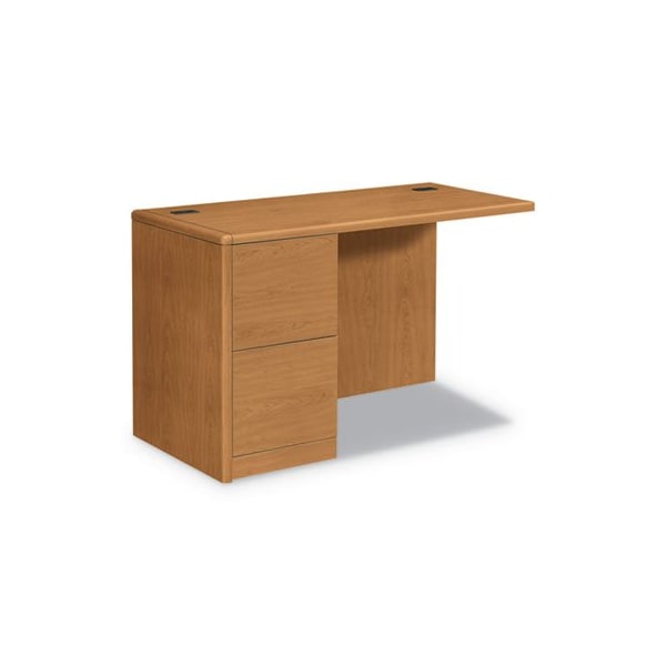 Make your work space work for you with this left return. Simply combine this left return with a right desk, right credenza or peninsula of your choice to create an L-workstation. Exclusive reinforced pedestal construction makes this HON desk withstand daily wear and tear. Soft, waterfall-shaped edges provide a comfortable typing surface. Includes two file drawers for documents. File drawers have built-in hangrails to accept hanging file folders. All drawers lock using the same key; lock core can be changed as security needs require. Return Orientation: Left; Color: Harvest; Color Family: Oak; Pedestal Count: 1.