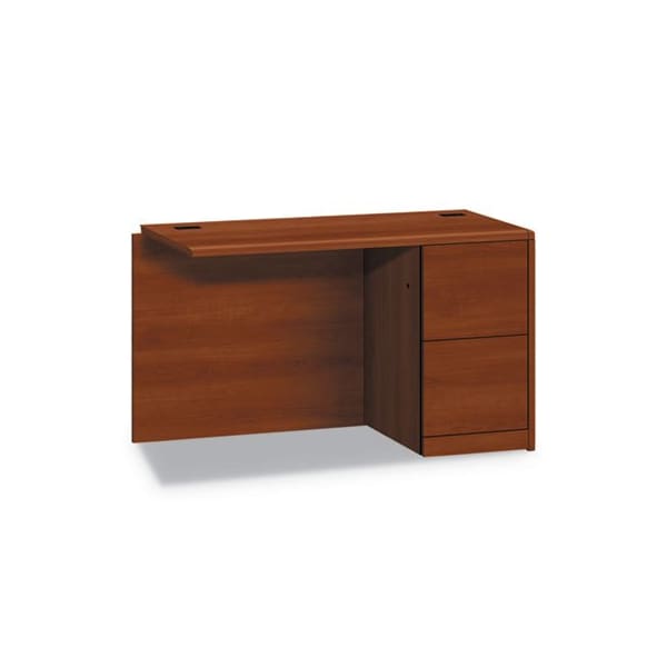 Polish up your workspace with this right return. Simply combine it with a left desk, left credenza or peninsula of your choice to create an L-workstation. Exclusive reinforced pedestal construction makes this HON desk withstand daily wear and tear like no other. All drawers lock using the same key; lock core can be changed as security needs require. Drawers glide on steel ball-bearings for years of smooth, reliable performance and open fully to give easy access to all contents. File drawers have built-in hangrails to accept hanging file folders. Return Orientation: Right; Color: Cognac; Color Family: Cherry; Pedestal Count: 1.