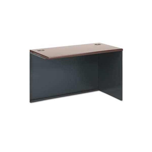 High-pressure laminate top is moisture-, scratch- and stain-resistant. Two work surface grommets for convenient cord management. Full-height modesty panel for privacy. Not freestanding. Use with desk shell to create an L-workstation or use two return shells with corner unit to create a corner workstation. Return Orientation: Right; Color: Mahogany/Charcoal; Color Family: Mahogany; Overall Width: 48in.