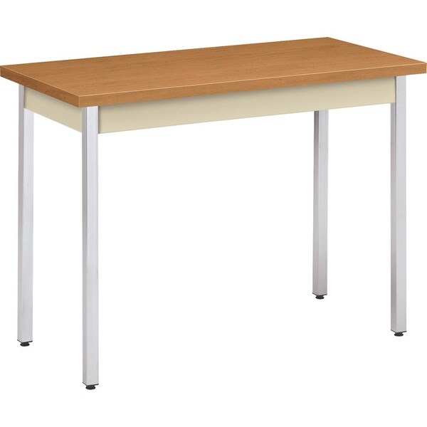 All-purpose utility table has a place in every work and educational environment. Chrome steel legs with glides and square edge detail are the perfect complement for HON 34000 series desks. Four-sided, 3-1/8" high steel apron provides reinforcement and a touch of color. The 1-1/8" thick top with self-edge, square corners and PVC edgebanding features Harvest laminate that is scratch-resistant, spill-resistant and stain-resistant. Adjustable leveling glides are made of nonmarring material for hard-surface floors. Whether for the library, mailroom or copier area, this utility table will prove to be more than useful. It comfortably seats one person while conserving floor space.