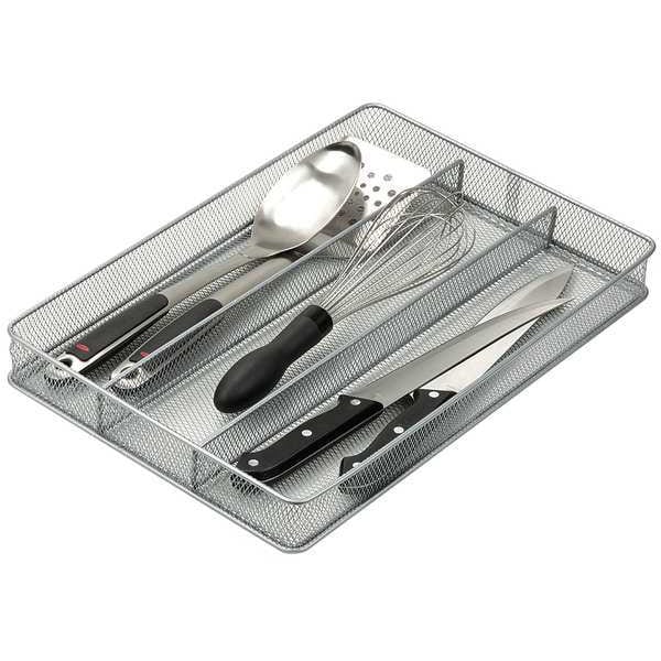 Cutlery Tray, Color Silver, Finish Powder Coated, Product Type Kitchen Drawer Organizer, Material Steel, Number of Compartments 3, Overall Height 2 in, Overall Length 16 in, Overall Width 11 in