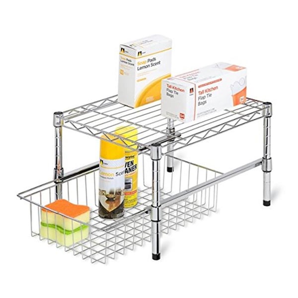 Adjustable Shelf with Basket Cabinet Organizer, Chrome. A flexible storage solution that adjusts in height to accommodate tall or shorter items in most cabinets. The contemporary design and brilliant chrome finish present a polished look when you open your cabinets. Handy and sizable, the wire basket pulls out for easy access to the contents inside and can be made to be removable, if desired. Measures 17.5 x 11.75 x 10.5 in.