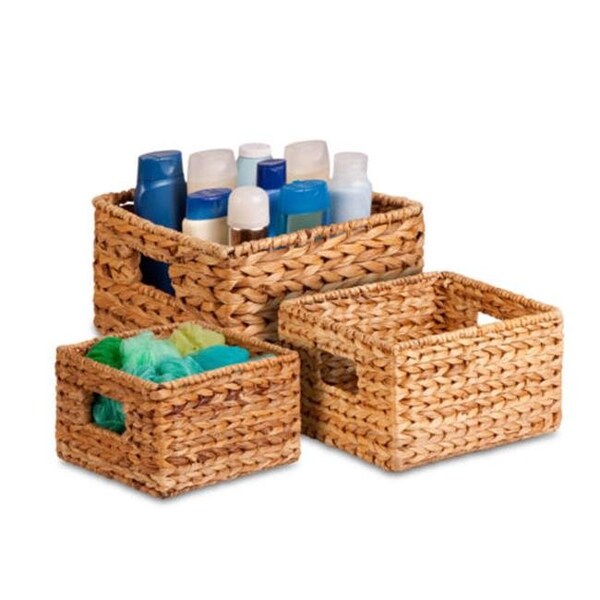 3-Pack Nesting Banana Leaf Baskets, natural/brown. Personalize your home with our unique banana leaf baskets. Our three-pack of banana leaf baskets nest nicely and range in size from 9.06 x 9.06 x 5.9 in. to 12.05 x 12.05 x 7.09 in. These all-purpose storage baskets can be used in any room without detracting from the look of your home. Each basket’s sturdy frame ensures it can handle whatever you store in it, from toiletries to linens to sports equipment. Sustainable banana leaf lets you organize your home while helping to save the planet. Coordinates with our wide variety of Honey-Can-Do banana leaf products.