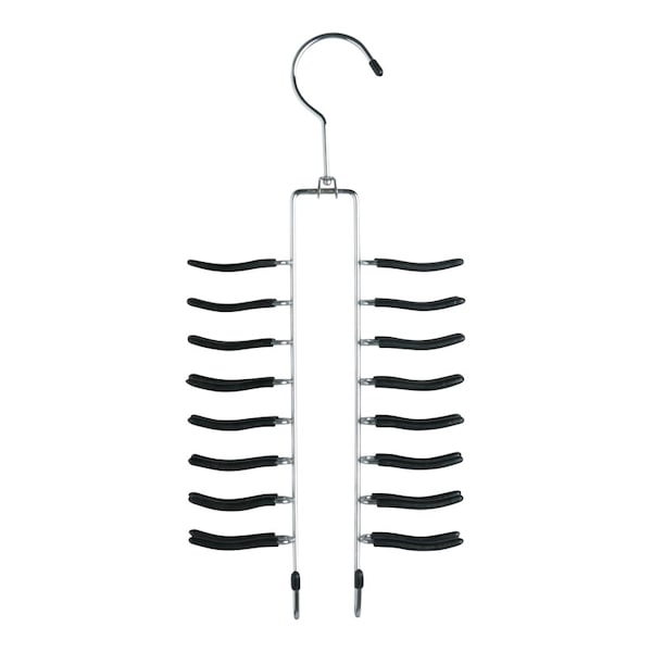 Non-Slip Accessory Hanger Chrome/Black. This versatile tie belt and scarf organizer provides maximum hanging space by accommodating up to 36 items in an easily accessible fashion. Rod hook hangs easily on any closet bar or wall hook. Durable metal construction with chrome finish and vinyl coating protects fine fabrics and leather