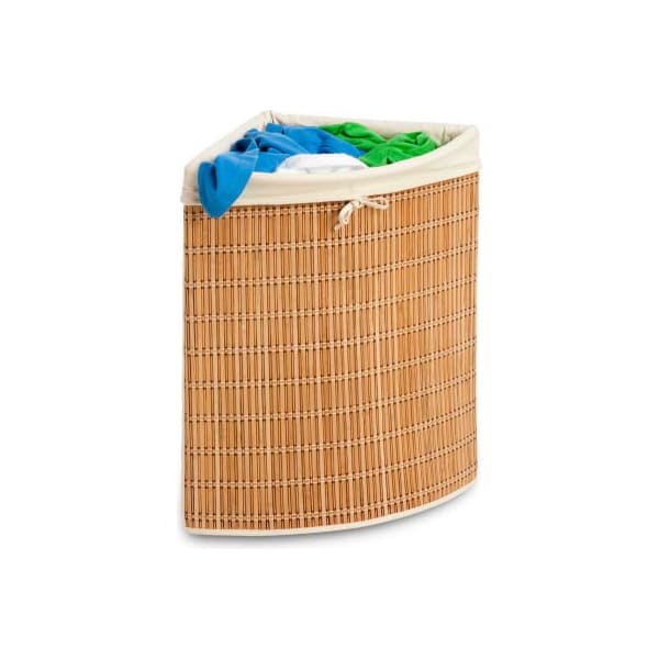 honey-can-do hmp-01618 wicker corner hamper with liner. A nice solution for small bedrooms and baths, this naturally beautiful corner hamper looks as good as it is functional. Capable of storing multiple loads of laundry, it is manufactured from a moisture resistant material. Includes a machine washable cotton canvas liner that can be easily removed for cleaning. Keep clothes off of the floor and your space neat and clean with this wicker-style hamper. features: removable cotton bag durable steel frame natural bamboo