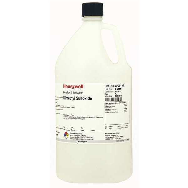 Dimethyl Sulfoxide, Concentration 0.1 Percent, CAS Number 67-68-5, Molecular Weight 78.13, Chemical Formula C2H6OS, Chemical Container Material Plastic, Chemical Container Type Bottle, Chemical Grade ACS, Chemical Container Size 4 L, Chemical Family Type Solvent, Calibration Certificate No, Shelf Life 18 mo, Shipping Restrictions N, Standards ACS, Package Quantity 4