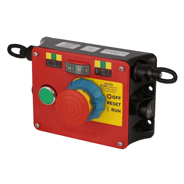 The Honeywell 2CCP Series Cable Pull Safety Switch is a MICRO SWITCH device rated for use as an emergency stop mechanism along conveyors and machinery. This cable pull switch offers a switching solution that is intended for use in accordance with manufacturer specifications and a configurable platform for various operational requirements.