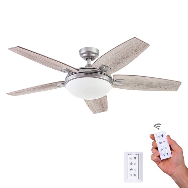 Honeywell ceiling fans make your home comfortable in summer and winter as well as help to reduce energy costs. Enjoy the welcome breeze in any room of your home while looking stylish. This modern multi-position indoor ceiling fan combines stylish details with influences for a truly inspiring fixture for your home. The Carmel features a lightly frosted domed glass shade with LED lighting. The innovative 5-blade design provides ultra-efficient, adjustable and energy efficient airflow while the LED lights provide ideal lighting for the area. Control your Honeywell ceiling fan with a touch of a button with our easy-to-use ceiling fan remote control with wall mount option batteries included. Enjoy year-round comfort by adjusting the reversible airflow switch that easily allows you to change the direction of the fan to properly distribute air. During hot summer months it will provide a cooling effect or when reversed, spreading warm air in the winter to help reduce energy costs. Specifications: Sizing: 48 inch 5-blade indoor fan for rooms up to 400 sq. ft. Lighting: 2 x E26 / A15 light bulbs included that provide 800 lumen, uses 8.5 watts, 3000K color temperature, dimmable 20% to 100%. About Honeywell Ceiling Fans Honeywell Ceiling Fans features a collection of fans in various sizes and specifications to ensure your choice of indoor or outdoor fan delivers optimum performance for your room's size. You can trust the quality of Honeywell Ceiling Fans to deliver maximum airflow and a stylish lighting option. Honeywell Ceiling Fans use high-quality materials that are long lasting and durable.