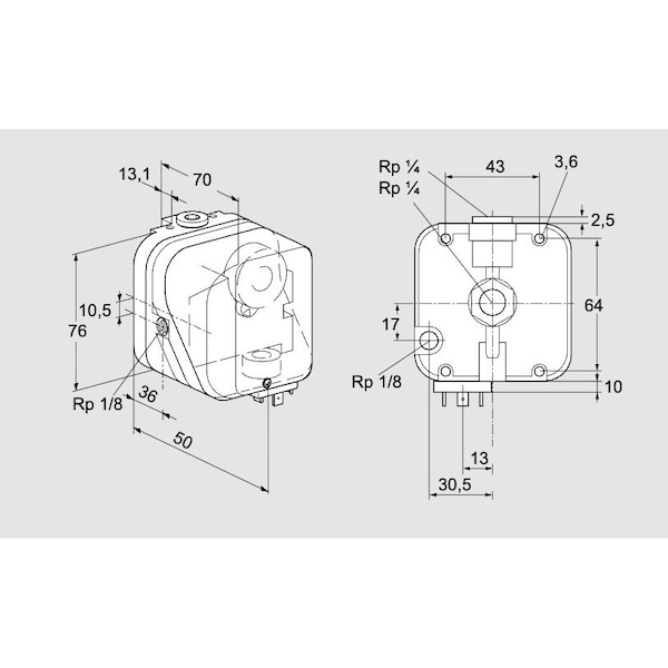 - US model (DG..T): Range of 0.2 to 200" WC; internal Rp 1/4" NPT or 1/8" NPT pneumatic connections; silver contacts up to max 240V AC/5A; gold contacts up to max 30V AC/DC/0.05A; screw terminals with M16x1.5 cable gland or optional locking/manual reset