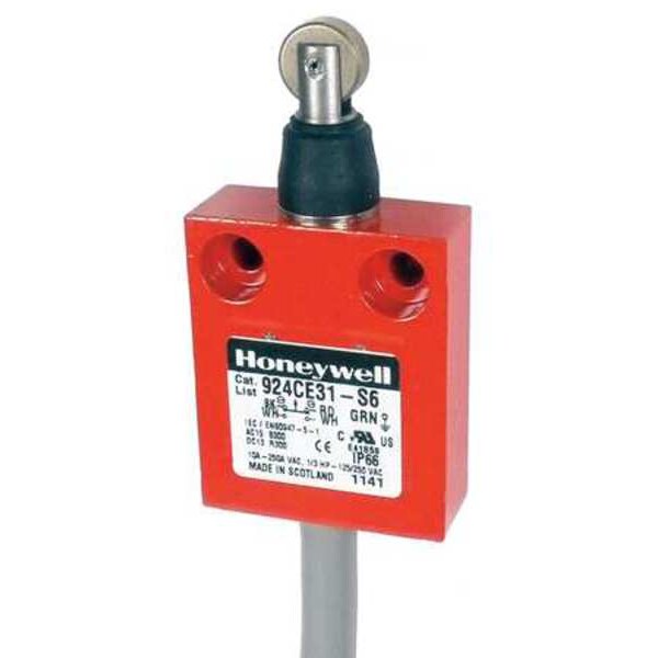 Safety Interlock Switch, Sintered Iron Roller Plunger with Boot Seal, Contact Form 1NO/1NC, Break Before Make, Direct Opening, Slow Action, Actuator Length 1.19 in, Connection Type 6 ft Dead End Cable, AC Contact Rating 100mA to 10A @ 240V, Series 924CE, DC Contact Rating 100mA to 10A @ 250V, Height 1.93 in, Width 1.57 in, Depth 0.63 in, NEMA Rating 1, 12, 13, 3, 4, IP Rating IP67, Operating Temp. Range 32 Degrees to 221 Degrees F, Contact Material Silver, Cable Length 6 ft, Body Material Zinc