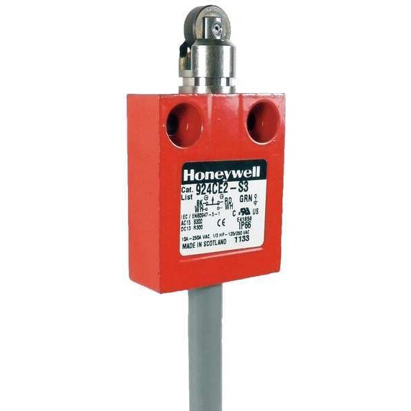 Safety Interlock Switch, Sintered Iron Roller Plunger, Contact Form 1NO/1NC, Break Before Make, Direct Opening, Slow Action, Actuator Length 1.19 in, Connection Type 3 ft Dead End Cable, AC Contact Rating 100mA to 10A @ 240V, Series 924CE, DC Contact Rating 100mA to 10A @ 250V, Height 1.93 in, Width 1.57 in, Depth 0.63 in, NEMA Rating 1, 12, 13, 3, 4, IP Rating IP66, Operating Temp. Range 32 Degrees to 221 Degrees F, Contact Material Silver, Cable Length 3 ft, Body Material Zinc
