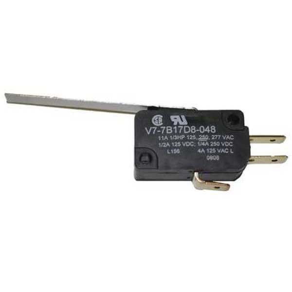 Miniature Snap Action Switch, Lever, Long, AC Contact Rating - Snap Action Switch 11 A 1/3 HP 125 V, 250 V or 277 V, DC Contact Rating - Snap Action Switch 1/2 A 125 V; 1/4 A 250 V, Contact Form- Switches SPDT, Lever Actuator Length - Snap Action Switch 2 in, Height - Snap Action Switch 0.63 in, Width - Snap Action Switch 1.14 in, Depth - Snap Action Switch 0.4 in, Electrical Connection - Snap Action Switch 3/16 in Quick Connect, Mounting Dimension - Snap Action Switch 0.87 in Centers, Series V7