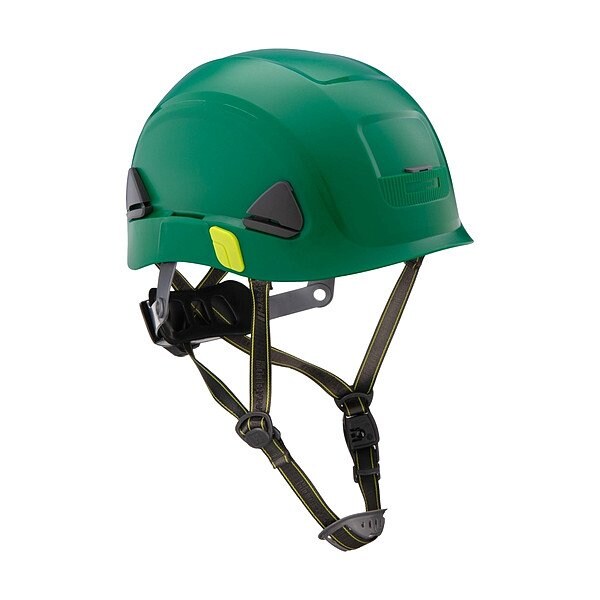 Climbing Helmet, ANSI Classification Type 1, Class E, Type 2, Class E, Head Protection Style Climbing, Head Protection Suspension Type Ratchet (8-Point), Head Protection Color Green, Head Protection Graphics No Graphics, Head Protection Material HDPE, Accessory Mounting Options Side-Slots