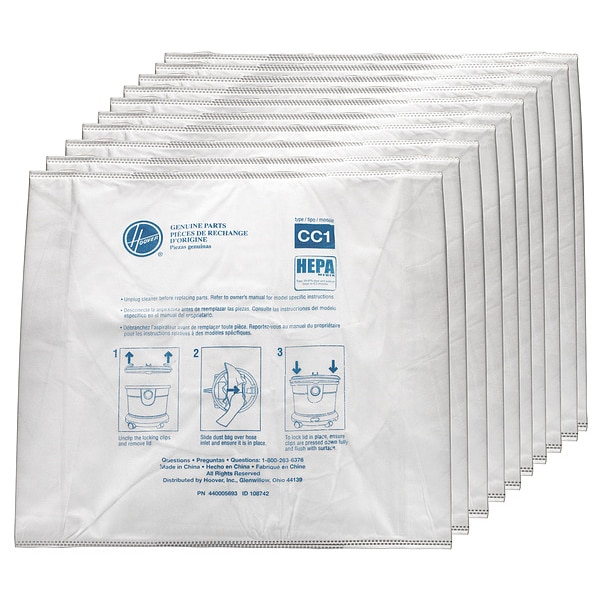 Vacuum Bag, For Vacuum Type Canister Vacuum, Fits Vacuum Brand Hoover Commercial, Fits Vacuum Models CH32008, Bag Filtration Type HEPA, Filter Efficiency 99.97 Percent at 0.3 microns, Bag Material Paper, Ply Count 3-Ply, Bag Pickup Type Dry, Bag Reusability Disposable, Height 16 1/2 in, Length 12 in, Width/Diameter 2 1/2 in, Package Quantity 10