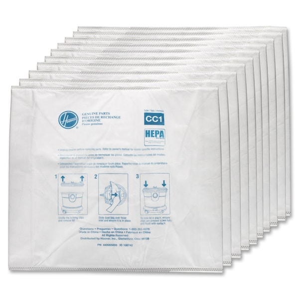Type-CC1 HEPA bags trap 99.97 percent of dust and pollens down to 0.3 microns for cleaner air in your office. Easy-to-install design goes on and removes quickly for time-saving replacement. Disposable material allows you to conveniently discard filled bags for time-saving replacement. Replacement bags are designed for Hoover HushTone Vacuum Cleaners (sold separately).