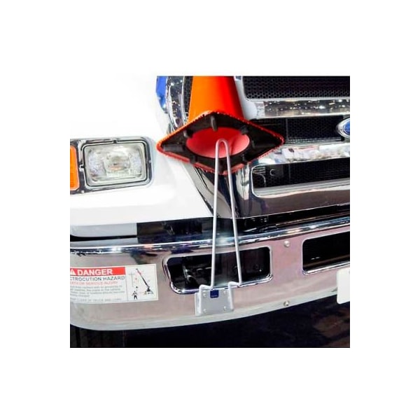 Horizon mfg. Traffic cone holder, 5911, holds 18" & 28" traffic cones traffic cone holder. Bolts onto truck bumpers or frames for convenient storage of traffic cones. Fits 18" and 28" cones. White, 4 holes for mounting. 18" h x 4"w.