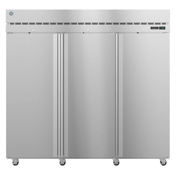 Dimensions: 82.5 in. W x 33.5 in. D x 79.5 in. H. Net capacity of 79.03 cubic feet. Unique ducted'' air distribution system. Epoxy electrocoated E-Coat evaporator coil to help fight corrosion for extended life. Stainless steel exterior front, sides, top and a stainless steel interior. Field reversible, spring assisted self closing door with stay open feature no kit req'd. One piece, full door length, extruded aluminum flush mount door handle. Lockable Full Stainless Doors. Insulated with 2 3/8 in. CFC free, foamed in place polyurethane. Interior LED light bar is mounted horizontally on the ceiling. Solid state digital controller with temperature alarms and LED display degrees F or degrees C. R290 refrigerant. 8 4 in. Stem Casters 4 with brakes are standard. Includes 9 epoxy coated wire coated wire shelves adjustable in 1 in. increments on stainless steel supports. Optional kits: 6 in. Legs, Epoxy or stainless steel shelves, Tray/pan slides, Foot pedal door opener, Additional air filter. Nominal Compres. of 3000 BTU/hr at 5/8 HPleft, BTU/hr at right. 230v/60/1, 10 ft. cord and plug. Shipping Crate: 86 in. L x 37.875 in. D x 81 in. H at 830 lbs. Top mounted energy efficient non-electric evaporation system. This item may incur additional shipping charges due to its weight or size.