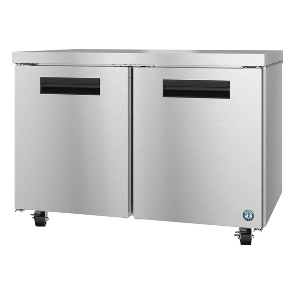 Dimensions: 48 in. W x 30 in. D x 33.75 in. H. Net capacity of 12 cubic feet. Innovative air distribution system distributes air evenly to maintain product temperature. Enamel coated evaporator coil for extended life. Stainless steel exterior front, sides, top and a stainless steel interior. Field reversible, spring assisted self closing door with stay open feature no kit req'd. Extruded aluminum flush mount door handle. 2 stainless steel doors with ABS interior liner. Insulated with 2 in. CFC free, foamed in place polyurethane. 2 epoxy coated wire shelves adjustable in 1/2 in. increments on anodized aluminum supports. Engineered to maintain food safe temperatures in 100 degrees F ambient conditions. R290 refrigerant. 4 4 in. Stem Casters 2 with brakes are standard. Optional kits: 2.25 in. or 6 in. casters, Stacking Kit, Epoxy wire shelf, Stainless steel shelf, Overshelves, See Spec Sheet for additional options. Nominal Compres. of 2431 BTU/hr at 1/3 HP. 115v/60/1, 10 ft. cord and plug. Shipping Crate: 52.5 in. L x 34 in. D x 36.5 in. H at 258 lbs. Automatic time-initiated heated defrost. This item may incur additional shipping charges due to its weight or size.