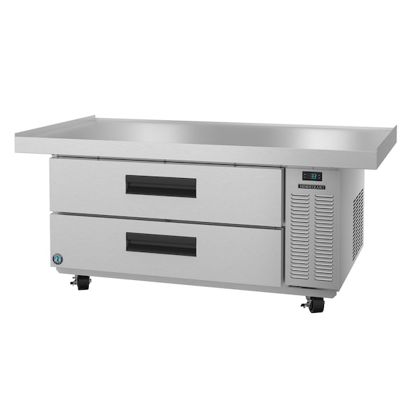 Dimensions: 60.5 in. W x 32.25 in. D x 26 in. H. 26 in. high work surface, supports up to 700 lbs. of equipment. Innovative air distribution system distributes air evenly to maintain product temperature. Enamel coated evaporator coil for extended life. Stainless steel exterior front, sides, top and a stainless steel interior. The drawer slides are constructed of 14 gauge stainless steel with durable acetal rollers. Extruded aluminum flush mount drawer handle. 2 stainless steel drawers, fully welded construction and securely fastened in the cabinet. Insulated with 2 in. CFC free, foamed in place polyurethane. Drawers capacity: 2.5 12 in. x 20 in. x 6 in. deep pan pans by others. Ceramic heat shield integral to 16 gauge stainless steel top protects food from high heat. R290 refrigerant. 4 4 in. HD Casters All with brakes are standard. Drawers are equipped with finger cut-outs for easy removal of pans. Optional kits: Additional long drawer divider bar, Short drawer divider bar, Condensor filter. Nominal Compres. of 1354 BTU/hr at 1/5 HP. 115v/60/1, 10 ft. cord and plug. Shipping Crate: 62 in. L x 35.5 in. D x 30.5 in. H at 370 lbs. Automatic time-initiated heated defrost.