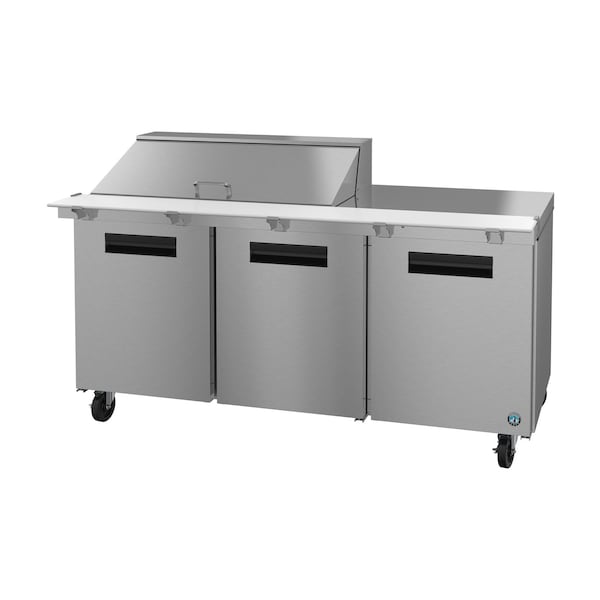 Dimensions: 72 in. W x 34 in. D x 44.25 in. H. Net capacity of 18 cubic feet. Innovative air distribution system distributes air evenly to maintain product temperature. Enamel coated evaporator coil for extended life. Stainless steel exterior front, sides, top and a stainless steel interior. Field reversible, spring assisted self closing door with stay open feature no kit req'd. Extruded aluminum flush mount door handle. 3 stainless steel doors with ABS interior liner. Insulated with 2 in. CFC free, foamed in place polyurethane. 3 epoxy coated wire shelves adjustable in 1/2 in. increments on anodized aluminum supports. Engineered to maintain food safe temperatures in 100 degrees F ambient conditions. R290 refrigerant. 4 6 in. Stem Casters 2 with brakes are standard. Includes 18 polycarbonate plastic 1/6th size pans, 4 in. deep can accept 6 in. deep pans. 72 in. x 10 in. x 0.5 in. thick white polyethylene cutting board is standard. Nominal Compres. of 2431 BTU/hr at 1/3 HP. 115v/60/1, 10 ft. cord and plug. Shipping Crate: 73.75 in. L x 36 in. D x 46.5 in. H at 418 lbs. Automatic time-initiated heated defrost. This item may incur additional shipping charges due to its weight or size.