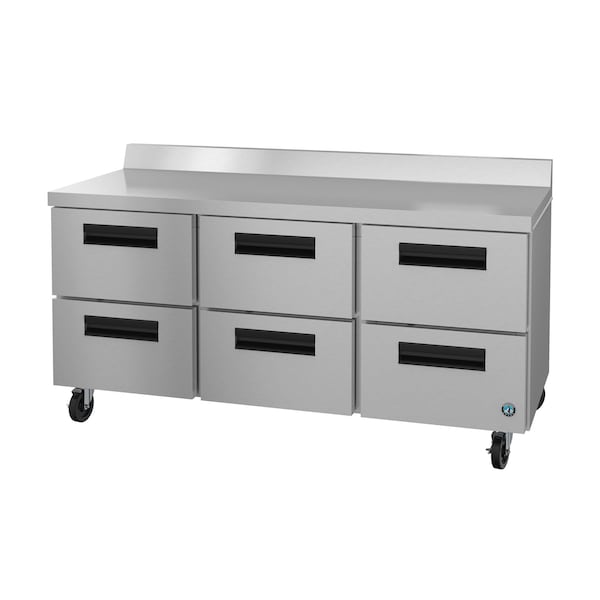 Dimensions: 72 in. W x 30 in. D x 40 in. H. Net capacity of 18.27 cubic feet. Innovative air distribution system distributes air evenly to maintain product temperature. Enamel coated evaporator coil for extended life. Stainless steel exterior front, sides, top and a stainless steel interior. The drawer slides are constructed of 16 gauge stainless steel with durable acetal rollers. Extruded aluminum flush mount drawer handle. 6 stainless steel drawers, fully welded construction and securely fastened in the cabinet. Insulated with 2 in. CFC free, foamed in place polyurethane. Drawers capacity: Top: 1 1/2 size and 1 1/3 size pans, 4 in. deep. Bottom: 1 1/2 size and 1 1/3 size, 6 in. deep pans pans by others. Engineered to maintain food safe temperatures in 100 degrees F ambient conditions. R290 refrigerant. 4 6 in. Stem Casters 2 with brakes are standard. Optional kits: 2.25 in. or 4 in. casters, Overshelves, Stainless steel back, Drawer divider bars. Nominal Compres. of 1354 BTU/hr at 1/5 HP. 115v/60/1, 10 ft. cord and plug. Shipping Crate: 73.75 in. L x 32 in. D x 40.5 in. H at 460 lbs. Automatic off-cycle defrost.