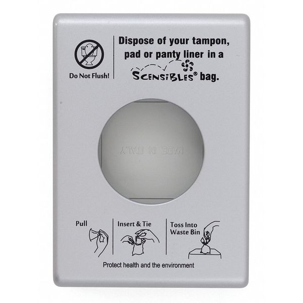 Sanitary Napkin Receptacle with Bag Dispenser, Receptacle Container Style Utility, Container Mounting Style Wall-Mounted, Height 5 1/4 in, Container Depth 1 in, Width 3 3/4 in, Material Plastic, Shape Rectangular, Color Silver, For Use With SBX50, Standards ISSA