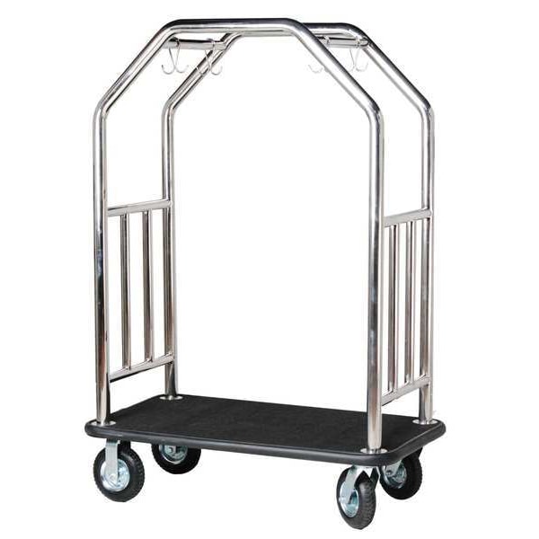 Bellman Cart, Steel, Stainless Steel Frame, Carpet Color Black, Bumper Color Black, Deck Length (In.) 48, Deck Width (In.) 27, 71 In. Height, Polished Finish, 8 Caster Dia. (In.), Load Capacity (Lb.) 1200